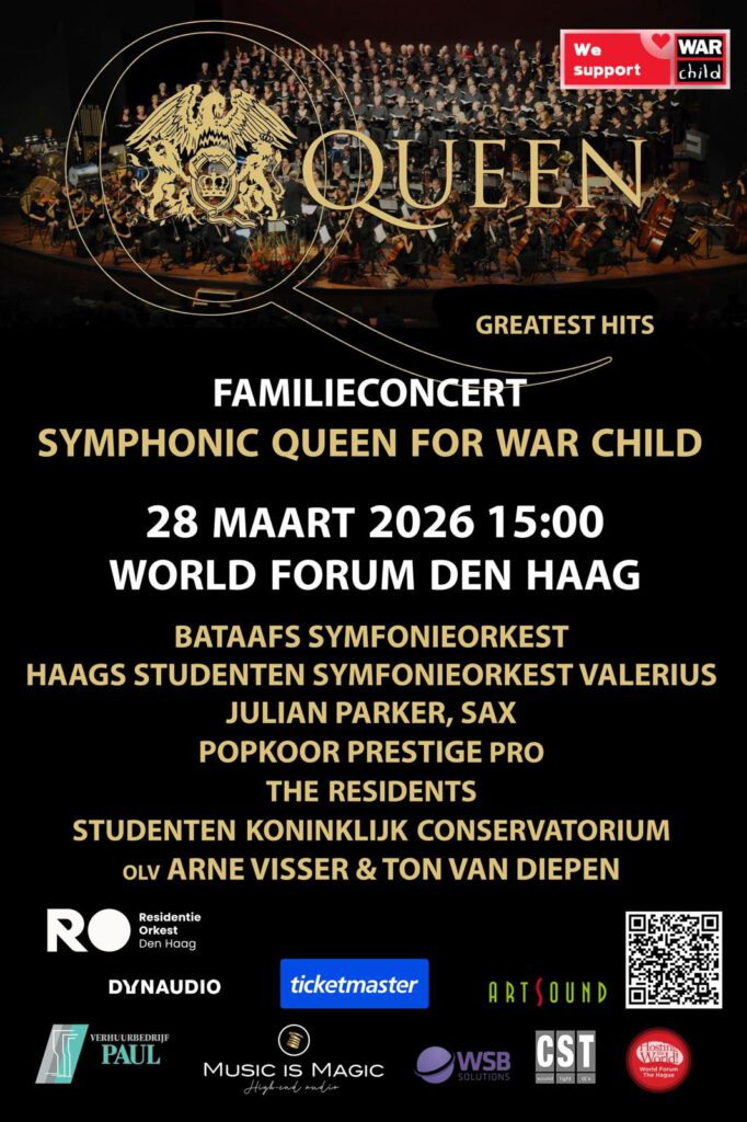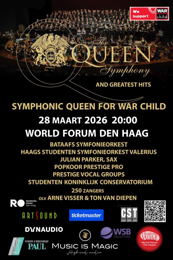 Imagine: Queen’s greatest hits, a full symphony orchestra, hundreds of singers, and a single, universally shared goal: helping children growing up in war zones. On Saturday 28 March 2026, it all comes together at The Hague’s World Forum for Symphonic Queen for War Child: an unforgettable benefit concert full of passion, power, and musical spectacle: